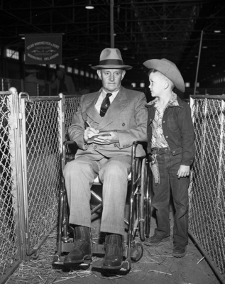 Joe H. Dixon of Fort Worth, former judge for the Southwestern Exposition and Fat Stock Show's sheep division who was infected by polio last year, makes a comeback as magazine reporter at the show. The helper is his son, Larry David.
