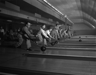 Leadoff men for the first shift of bowlers in the annual city meet start a warm-up ball at Bowling Center Saturday. Bowlers in the foreground are, left to right, Dale McFarland, Jack Brackett, Gus Meyer, Norman Coats, G. L. Hester and Roy Ewing. The tournament will continue for three week-ends. Singles and doubles are set Sunday.