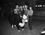 Stock Show cattle champs. Mr. Carter with Sue White and W. R. Watt and Big Spring Special II, grand Champion Steer of the stock show.