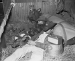 Butch Brundage and George Irvin, both of Grand Prairie take a short nap in stall with calf, "Buster"