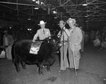 Two of the breed champions of the Stock Show steer show. A College Triumph, champion Shorthorn, owned by Oklahoma A&M College. With the animal is Orville Deewall, college herdsman.
