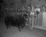 Champion open division Shorthorn steer of the Southwestern Exposition and Fat Stock Show is College Triumph, a summer yearling, shown by Oklahoma A&M College. Pictured with the steer is Orville Deewall, college herdsman.