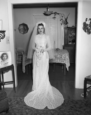 Image shows Mrs. Charles A. Burt in a wedding dress. Published in Fort Worth Star-Telegram morning edition April 16, 1950.