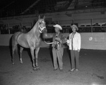 Sally McDonald, owned by Mr. and Mrs. Russell Boomer of Fort Worth, was named champion Monday of the pleasure type Palomino mare class at the Southwestern Exposition and Fat Stock Show horse show. Mrs. Boomer presents the American Palomino Horse Breeders Association award to her husband., who is holding to the ribbon awards.