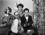 Detective A. L. Armstrong, who a year ago Saturday was critically wounded in a Meadowbrook gun battle that killed Detective H. E. Cleveland, is back with his family. With him are his wife, Irene; daughter Nancy, 10, and Roby, 8, who holds the Dallas Police medal of Honor presented Armstrong for outstanding valor.