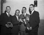 Robert Kauffman of Iowa State College, left, holds plaque he won Tuesday as high individual in the intercollegiate meat judging contest. Beside him holding cup they won as the winning team are members of the Oklahoma A&M team. They are, left to right, Sam Davis, R. J. Cooper and Richrad Willham.