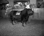 Grand champion Angus bull of the Stock Show was Prince 105 of Simon Angus Farm, an entry of Simon Angus Farm, Madison, Kansas shown with the bull is John Simon.