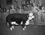 The reserve champion is MW Zatos Larryana 4th, owned by Milky Way Hereford Ranch, Phoenix, Arizona. Left to right, Allan Feeney, owner of the ranch; W. R. Watt, Fort Worth, show president and manager, and Clark Wood, who showed the Hereford for Milky Way.