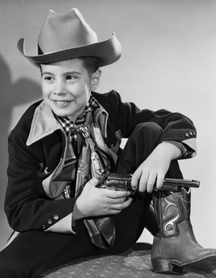 Charles Freret wearing cowboy attire. The young boy is shown seated on the floor and smiling for the photo.