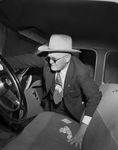 City Detective Herman Cobb examines a car identified as the one used in the $8,900 robbery of the Bronte First National Bank. The auto was found abandoned on a downtown Fort Worth street.