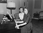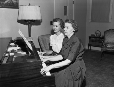 Mrs. Maybell McDaniel, the recently elected president of the Fort Worth Classroom Teachers Association, is shown sitting at a piano with her 16 year-old daughter Nancy, an ardent music student. The two both share an interest in music. Published in the evening edition, April 18, 1950.