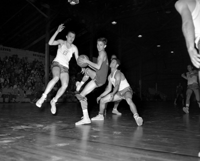 Arlington Height's Floyd Wade looks for aid as he grabs a rebound and finds Poly's Bob (Tiger)Thompson (8) about to poune upon him from the front and I. B child (3) waiting behind. The Parrots won their seven staright conference game Tursday night beating the Jackets, 57-37.