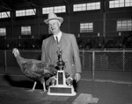 Homer P. Lee with the champion turkey of the poultry show and trophy awarded at the Southwestern Exposition and Fat Stock Show, exhibited by Lee and Smith Ranch, Midlothian.