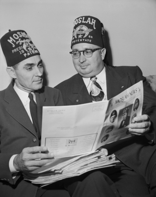 Novice Chairman Rex P. Wylie of the Moslah Temple Shrine, is shown conferring with potentate Marvin Mabry, at the Moslah Temple Shrine Spring Ceremonial. Published in the morning edition on April 16, 1950.