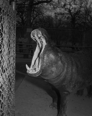 The hippopotamus, finds the fence a little tall, so she stands firmly on her short legs and yells the latest news to her long-necked friend.