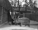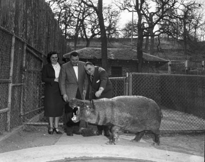 Forest Park Zoo's dwarf hippopotamus opens her mouth wide in greeting to Mr. and Mrs. Ronald Lindemann of Catskill Game Farm in New York, who sold her to the zoo in September. Standing with them is Director Hamilton Hittson, center. Lindemann, who owns Catskill Game Farm in New York, supplies the zoo with many of its hoofed animals. The visitors are the nation's foremost importers of wild animals.