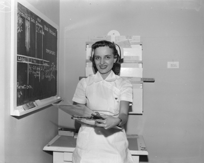 Miss Martha Ann Luckey, of 3755 Yucca, is shown sitting at the center of the image. Miss Luckey, a nurse at Saint Joseph's Hospital, was one of the witnesses that heard the fatal gunshots that killed Mr. Selwyn Smith three years prior in April, 1947. Mr. Smith was a former city-employee, and was 64 at the time of his death. Published in the evening edition, April 15, 1950.