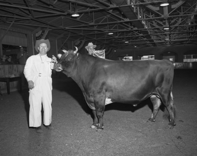 Harold Webb poses the grand champion Jersey bull of the Southwestern Exposition and Fat Stock Show exhibited by Webb Jersey Farm, Cleburne.