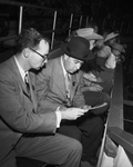 Alberto Perez, right, sent to the United States by the Bank of the Republic of Colombia to tour livestock shows of this nation, receives from Ernest Allen Junior an explanation of what's next on the program at the Southwestern Exposition and Fat Stock Show's Friday rodeo matinee.