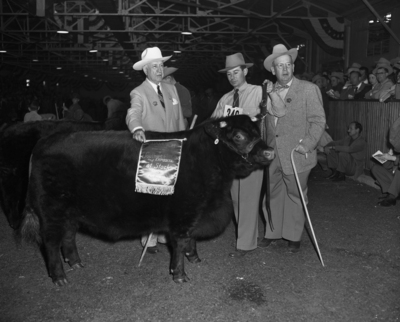 Stock Show cattle champs. Mr. Carter with Sue White and W. R. Watt and Big Spring Special II, grand Champion Steer of the stock show.