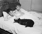 Brothers Donald Culbertson and Doyle Culbertson are shown laying with their dog. Donald Culbertson, 15, is shown petting cocker spaniel "Smoky", with his younger brother Doyle, 13, looking over his shoulder. The two boys along with Smoky and another boy were all involved in a Trinity River maroon-and-rescue incident the previous day. Published in the evening edition, April 14, 1950.
