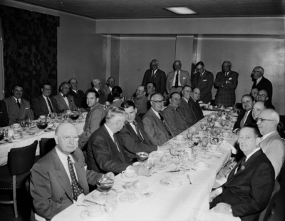 At luncheon given at the Fort Worth Club before rodeo. Left to right, standing, Dallas Mayor J. B. Adoue Jr., Amon Carter Ben Wooten, R. L. Thornton Sr., and Earl Wyatt of Dallas. At far table, clockwise, J. K. Crossman (Dallas), Wed Maddox, J. B. Thomas, Allen Meriam (Dallas), Fort Worth Mayor J. R. Edwards, James Stewart, W. R. Wyatt, James F. Chambers (Dallas), and James W. Aston (Dallas). At table in foreground, clockwise, William Holden, Ernest Allen, Estill A. Vance, Roger Ringo, Raymond Buck, R. Wright Armstrong, J. M. North, Max Clampitt (Dallas), Ben Smith (Dallas), Ed J. Ernest, J. Lee Johnson Jr., and Leo Corrigan (Dallas).
