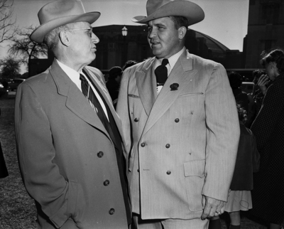 Roy M. Johnson of Ardmore, left, who paid for five coaches in the 14-car train special from Oklahoma, and Republican W. D. Bradley of Addington, who represented Oklahoma Government Johnston Murray, discuss the show events.