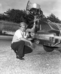 Mr. Harry Davis is shown kneeling next to his boat as he makes the final inspection before he uses it in a free-for-all event. Published in the morning edition, April 16, 1960.