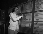 Marvin Bradshaw points to his name on scoreboard after taking over first place in the Class B all events in the 23rd annual city bowling tournament Saturday at Bowling Center. He hit 1,726.