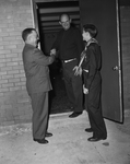 Ed Gillespie, center, scoutmaster for 25 years, opens the door to the new Boy Scout hut to Dan G. Douglass, left, and Pat Fagan. Douglass is grand Knight of the Monsignor Robert M. Nolan Council of the Knights of Columbus, which sponsors the troop and provided the hut. Fagan is junior assistant scoutmaster.