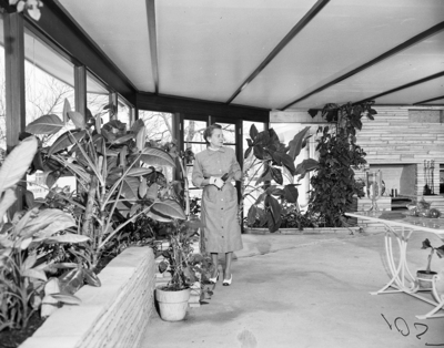 Mrs. John L. Ashe, is pictured in the lanai, which recently was added to her home, and where she has had prodigious success with growing tropical plants. The room equipped with a large fireplace and giant planter boxes, makes an ideal room in which to entertain large groups.