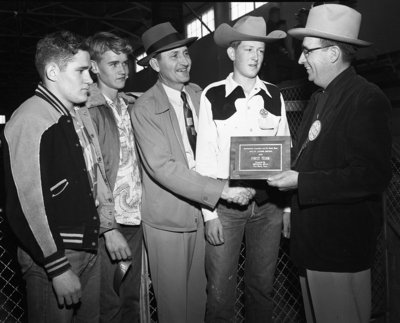 George P. McCarthy of Universal Mills, Fort Worth, presents a plaque to members of the Mansfield Future Farmer of America poultry judging team, who won first place in the contest Saturday at the Southwestern Exposition and Fat Stock show. Left to right are Donald Jordan, Neal Spencer, Coach Ben Barber and Paul Gaines.