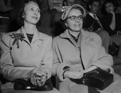 Mrs. Everett O. Fenton, right, of Des Moines, Iowa, founder of Alpha Iota, international honorary business sorority, and the organization's grand president, watches the Saturday night rodeo at the Southwestern Exposition and Fat Stock Show with Mrs. Harvey Keyes of 2901 South Hills Avenue, regional councilor. The sorority opened its two-day regional conclave Saturday at the Worth Hotel.