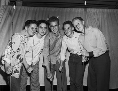 Third place winners in junior casting was the Dallas contingent, composed of (left to right) Regis Rhea, Buddy Laden, Lawrence Humphrey, Gordon Hines and Buster Mayfield. Score was 422. Published in the Fort Worth Star-Telegram morning edition, April 16, 1950.