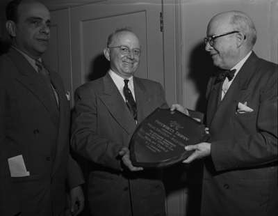Leonard Dickinson, center, immediate past president of the Moslah Temple Drum and Bugle Corps, accepts a plaque from Potentate Roscoe Carnrike, right, on behalf of the corps, addressed the uniformed unit which rendered the best service in 1952. Abe Mehl, left, is now corps president. The plaque is awarded annually by the potentate. It was presented at a dinner at Worth Hotel Monday night.