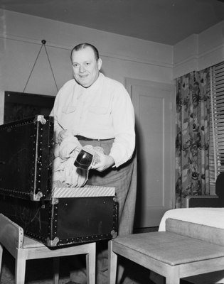 Bill (Tiny) Scurlock, Gloves director in Beaumont, unpacks after arriving here Monday for State Golden Gloves Tournament opening Wednesday, February 11.