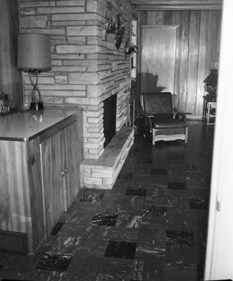 The den in the new home of John G. Turner reflects warm tones with it's Tennessee crab orchard stone fireplace wall and sycamore-paneled walls.
