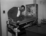 District Attorney Fender inspects pinball machine taken from El Charro Night Club. It is the first found in operation here since 1951.