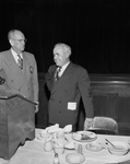 Kiwanis District Governor Hugh M. Sandlin, right, confers with J. G. Prewett, club president, before a speech at the North Side Kiwanis Club luncheon. Published in Fort Worth Star-Telegram morning edition April 15, 1950.
