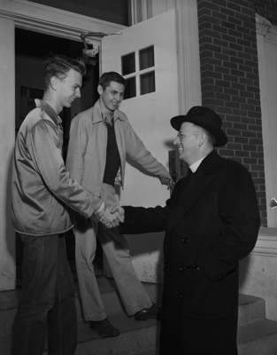 Jimmy Bass, left, and Jimmy Klein, 11th grade students at Laneri High School, greet Reverend John A. Torisky of Houston who will open the annual students' retreat at the school Thursday.