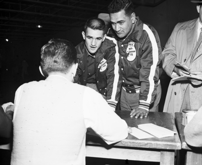 Waco's Jerry Flanagan, left, and John Meatoga register for state Golden Gloves. An unidentified man's back is facing the camera.
