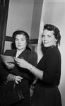 Mrs. George H. Copeland, left, on behalf of Zeta Tau Alpha alumnae here, presents a check for $50 to Miss Jessie Wilson, right, acting director of the Fort Worth Crippled Children's Society.