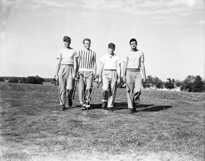 Texas Women's College and Austin College link a competitors stroll up at Meadowbrook fairway during dual matches. Left to right are Bill Evans, AC; Doug Higgins, TWC; John Williams, AC, and Bill Cole, TWC. Rams beat Kangaroos, 6-0. Published in Fort Worth Star-Telegram morning edition April 15, 1950.