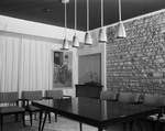 The L. R. Sarazan home is one contemporary house that has a separate dining room. Black, white, and chartreuse created an arresting color plan. Chrome light fixtures are an added touch of modern design.