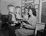 Mrs. James Q. Hamrick receives Valentines from her 7-year-old sons, Wynne, Glynne, and Lynne. She plays Cupid for the triplets each February 14 by helping them choose and address their Valentine greetings. The boys attend Arlington Heights Elementary School.
