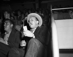 Noble Rust, applauds Jorgensen Rally at the Golden Gloves tournament. There is a man sitting beside him, and more spectators sitting behind him.