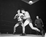 Campbell (Wildman) Woodman, left, of Wichita Falls readies a right for Billy Napier of Corpus Christi in their Saturday night quarterfinals bout in the state Golden Gloves. Woodman knocked out the Corpus boxer in the second round. There is a referee at right, observing the boxers.