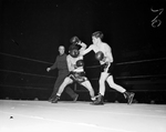 Paul Jorgensen, right, Beaumont, rallies sharply with glancing right to head of Raymond Garcia, Wichita Falls, in third round of featherweight scrap in February 14 Gloves. Garcia won decision. Referee is J. C. Oakley.