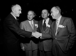 Captain Eddie Rickenbacker, left, shakes the hand of R. G. Peers, Montreal exporter and liaison man for Canada in Washington on defense, as August C. Esenwien, left, Convair division manager here, and C. T. McLaughlin, Snyder oil man, look on at Convair Management Club luncheon Saturday. Rickenbacker was given large B-36 desk piece and western buckle set. Rickenbacker, president of Eastern Airlines and famed World War I flying ace was principal speaker of the annual Chamber of Commerce banquet, Feb. 13.