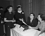 Mrs. John E. Martin of Carroll, Iowa, and Mrs. R. W. Holleyman of Lake Charles, Louisiana have their tickets checked by Mrs. Nelson Greeman of San Antonio, and Mrs. J. Ralph Ewing, Fort Worth, all left to right, at the registration for wives of optometrists attending the three-day Southwest Congress of Optometry being hosted by Hotel Texas.